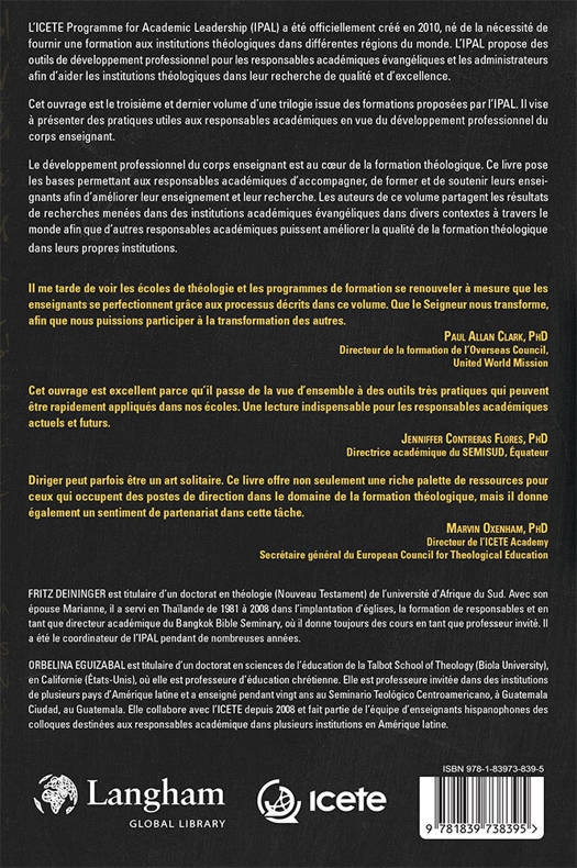 Le développement professionnel du corps enseignant est au coeur de la formation théologique. Ce livre pose les bases permettant aux responsables académiques d'accompagner, de former et de soutenir leurs enseignants afin d'améliorer leur enseignement et leur recherche. Les auteurs de ce volume partagent les résultats de recherches menées dans des institutions académiques évangéliques dans divers contextes à travers le monde afin que d'autres responsables académiques puissent améliorer la qualité de la formation théologique dans leurs propres institutions.