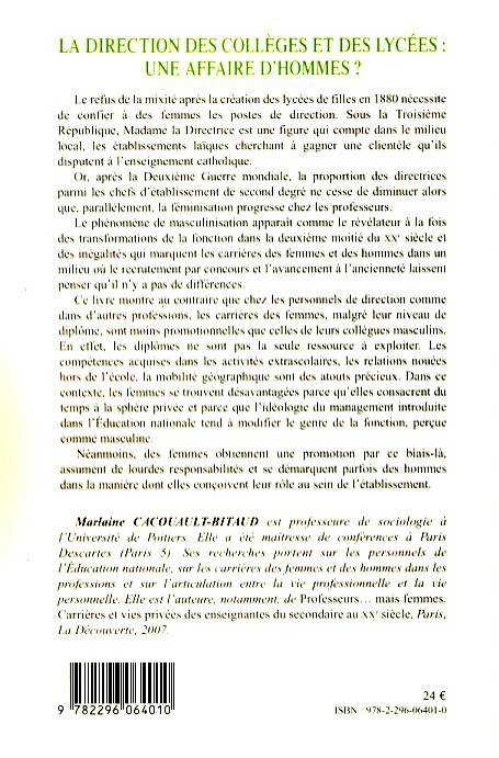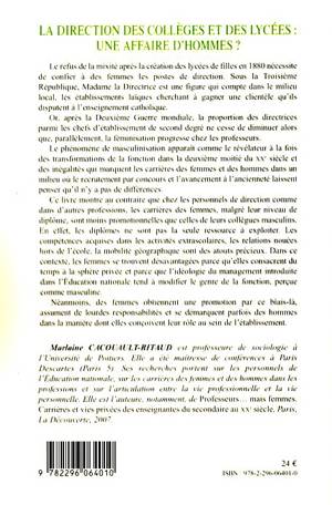 Le refus de la mixité après la création des lycées de filles en 1880 nécessite de confier à des femmes des postes de direction. Après la Deuxième Guerre mondiale, la proportion des directrices parmi les chefs d'établissements du second degré ne cesse de diminuer alors que la féminisation progresse chez les professeurs. Ce livre montre que chez les personnels de direction, les carrières des femmes, malgré leur niveau de diplôme, sont moins promotionnelles que celles de leurs collègues masculins.