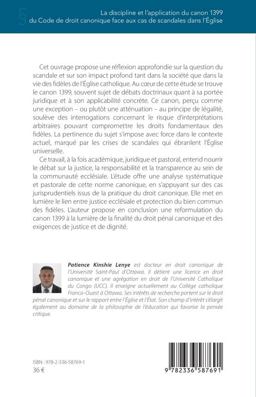 Cet ouvrage propose une réflexion approfondie sur la question du scandale et sur son impact profond tant dans la société que dans la vie des fidèles de l'Église catholique. Au coeur de cette étude se trouve le canon 1399, souvent sujet de débats doctrinaux quant à sa portée juridique et à son applicabilité concrète. Ce canon, perçu comme une exception - ou plutôt une atténuation - au principe de légalité, soulève des interrogations concernant le risque d'interprétations arbitraires pouvant compromettre les droits fondamentaux des fidèles. La pertinence du sujet s'impose avec force dans le contexte actuel, marqué par les crises de scandales qui ébranlent l'Église universelle. Ce travail, à la fois académique, juridique et pastoral, entend nourrir le débat sur la justice, la responsabilité et la transparence au sein de la communauté ecclésiale. L'étude offre une analyse systématique et pastorale de cette norme canonique, en s'appuyant sur des cas jurisprudentiels issus de la pratique du droit canonique. Elle met en lumière le lien entre justice ecclésiale et protection du bien commun des fidèles. L'auteur propose en conclusion une reformulation du canon 1399 à la lumière de la finalité du droit pénal canonique et des exigences de justice et de dignité.