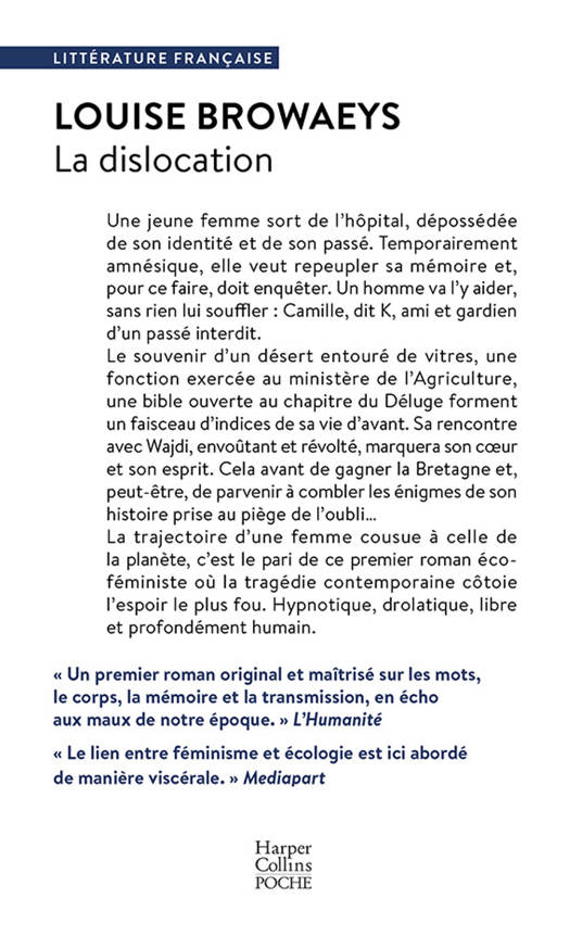 Une jeune femme sort de l’hôpital, dépossédée de son identité et de son passé. Temporairement amnésique, elle veut repeupler sa mémoire et, pour ce faire, doit enquêter. Un homme va l’y aider, sans rien lui souffler : Camille, dit K, ami et gardien d’un passé interdit. Le souvenir d’un désert entouré de vitres, une fonction exercée au ministère de l’Agriculture, une bible ouverte au chapitre du Déluge forment un faisceau d’indices de sa vie d’avant. Sa rencontre avec Wajdi, envoûtant et révolté, marquera son cœur et son esprit. Cela avant de gagner la Bretagne et, peut-être, de parvenir à combler les énigmes de son histoire prise au piège de l’oubli. La trajectoire d’une femme cousue à celle de la planète, c’est le pari de ce premier roman éco-féministe où la tragédie contemporaine côtoie l’espoir le plus fou. Hypnotique, drolatique, libre et profondément humain.