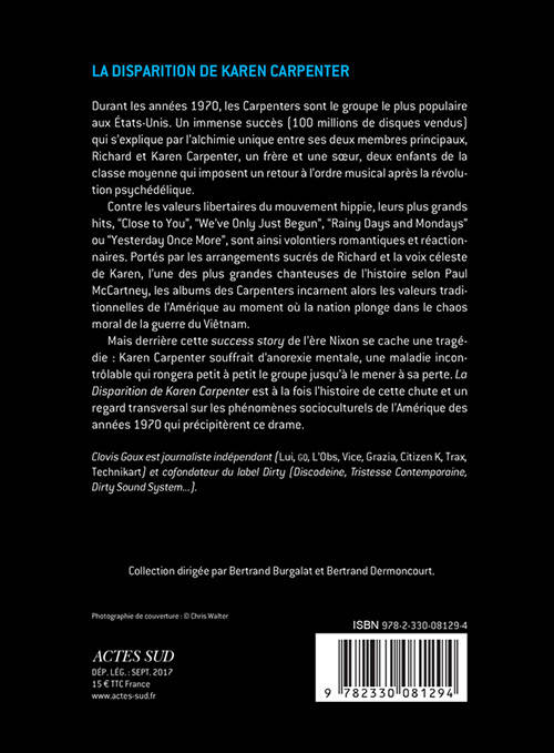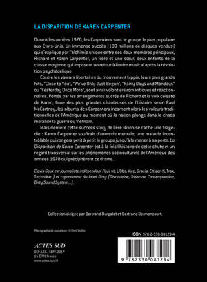 Durant les années 1970, The Carpenters est le groupe le plus populaire aux États-Unis. Un immense succès (100 millions de disques vendus) qui s'explique par l'alchimie unique entre ses deux membres fondateurs, Richard et Karen Carpenter, un frère et une soeur. Ces deux enfants de la classe moyenne imposent un retour à l'ordre musical après la révolution psychédélique, avec des hits aussi romantiques que réactionnaires, tels «Close to you», «We've Only Just Begun» ou «Rainy Days and Mondays». Mais derrière cette «success story» se cache une tragédie. «La Disparition de Karen Carpenter» raconte cette histoire, nous amenant à porter un regard de côté sur les grands phénomènes socio-culturels qui marquèrent l'Amérique de l'époque.