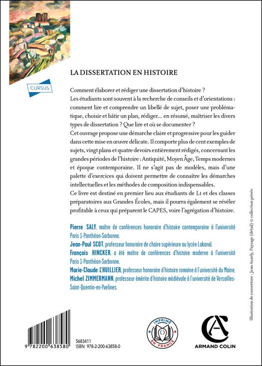 Comment élaborer et rédiger une dissertation d’histoire ? Les étudiants sont souvent à la recherche de conseils et d’orientations : comment lire et comprendre un libellé de sujet, poser une problématique, choisir et bâtir un plan, rédiger... en résumé, maîtriser les divers types de dissertation ? Que lire et où se documenter ? Cet ouvrage propose une démarche claire et progressive pour les guider dans cette mise en oeuvre délicate. Il comporte plus de cent exemples de sujets, vingt plans et quatre devoirs entièrement rédigés, concernant les grandes périodes de l’histoire : Antiquité, Moyen Âge, Temps modernes et époque contemporaine. Il ne s’agit pas de modèles, mais d’une palette d’exercices qui doivent permettre de connaître les démarches intellectuelles et les méthodes de composition indispensables. Ce livre est destiné en premier lieu aux étudiants de L1 et des classes préparatoires aux Grandes Écoles, mais il pourra également se révéler profitable à ceux qui préparent le CAPES, voire l’agrégation d’histoire.