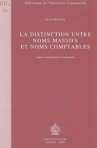 Cet ouvrage est consacre a l'etude de la distinction linguistique entre noms massifs (lait, mobilier, desordre, amour...) et noms comptables (chat, equipe, combat, chose...). Les premiers sont normalement invariables, tandis que les seconds s'emploient librement au singulier et au pluriel. Apres avoir etabli qu'il s'agit bien d'une distinction morpho-syntaxique, l'ouvrage discute la possibilite de caracteriser semantiquement cette distinction. Les recherches existantes ne tiennent compte, essentiellement, que des noms s'appliquant au domaine materiel. Ce travail, au contraire, examine en detail aussi bien les noms concrets qu'abstraits. Il propose de redefinir les proprietes souvent attribuees aux noms massifs (references distributive et cumulative), grace, notamment, a une nouvelle notion de partie. Concernant les noms comptables, il montre qu'aucune propriete purement semantique n'est necessaire pour qu'un nom soit de ce type. L'ouvrage se termine par l'analyse des conversions (emplois massifs des noms comptables, et vice versa), et du role qu'y jouent les facteurs pragmatiques.