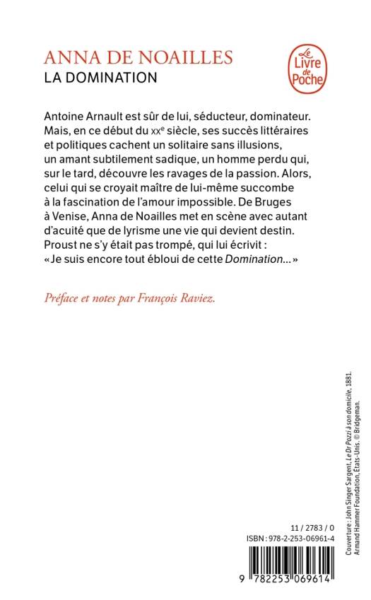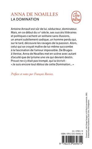 Antoine Arnault est sûr de lui, séducteur, dominateur. Mais, en ce début du xxe siècle, ses succès littéraires et politiques cachent un solitaire sans illusions, un amant subtilement sadique, un homme perdu qui sur le tard découvre les ravages de la passion. Alors, celui qui se croyait maître de lui-même succombe à la fascination de l’amour impossible. De Bruges à Venise, Anna de Noailles met en scène avec autant d’acuité que de lyrisme une vie qui devient destin. Proust ne s’y était pas trompé, qui lui écrit : « Je suis encore tout ébloui de cette Domination... »