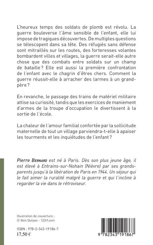 L'heureux temps des soldats de plomb est révolu. La guerre bouleverse l'âme sensible de l'enfant, elle lui impose de tragiques découvertes. De multiples questions se télescopent dans sa tête. Des réfugiés sans défense sont mitraillés sur les routes, des forteresses volantes bombardent villes et villages, la guerre serait-elle autre chose que des combats entre soldats sur un champ de bataille ? Elle est aussi la première confrontation de l'enfant avec le chagrin d'êtres chers. Comment la guerre réussit-elle à arracher des larmes à un grand-père ? En revanche, le passage des trains de matériel militaire attise sa curiosité, tandis que les exercices de maniement d'armes de la troupe d'occupation le divertissent à la sortie de l'école.La chaleur de l'amour familial confortée par la sollicitude maternelle de tout un village parviendra-t-elle à apaiser les tourments et les inquiétudes de l'enfant ?