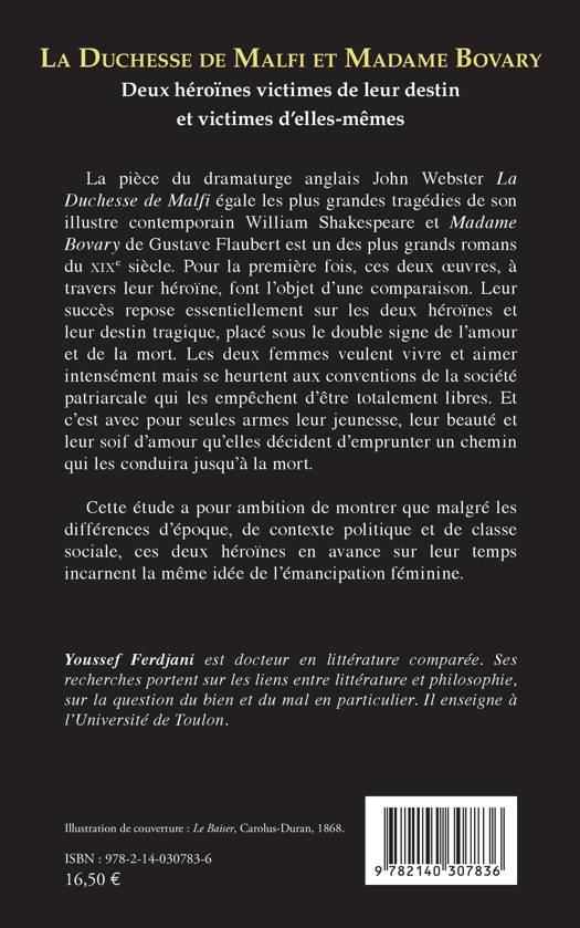 La pièce du dramaturge anglais John Webster La Duchesse de Malfi égale les plus grandes tragédies de son illustre contemporain William Shakespeare et Madame Bovary de Gustave Flaubert est un des plus grands romans du XIXe siècle. Pour la première fois, ces deux oeuvres, à travers leur héroïne, font l'objet d'une comparaison. Leur succès repose essentiellement sur les deux héroïnes et leur destin tragique, placé sous le double signe de l'amour et de la mort. Les deux femmes veulent vivre et aimer intensément mais se heurtent aux conventions de la société patriarcale qui les empêchent d'être totalement libres. Et c'est avec pour seules armes leur jeunesse, leur beauté et leur soif d'amour qu'elles décident d'emprunter un chemin qui les conduira jusqu'à la mort. Cette étude a pour ambition de montrer que malgré les différences d'époque, de contexte politique et de classe sociale, ces deux héroïnes en avance sur leur temps incarnent la même idée de l'émancipation féminine. Youssef Ferdjani est docteur en littérature comparée. Ses recherches portent sur les liens entre littérature et philosophie, sur la question du bien et du mal en particulier. Il enseigne a l'Université de Toulon. Illustration de couverture: Le Baiser, Carolus-Duran, 1868.