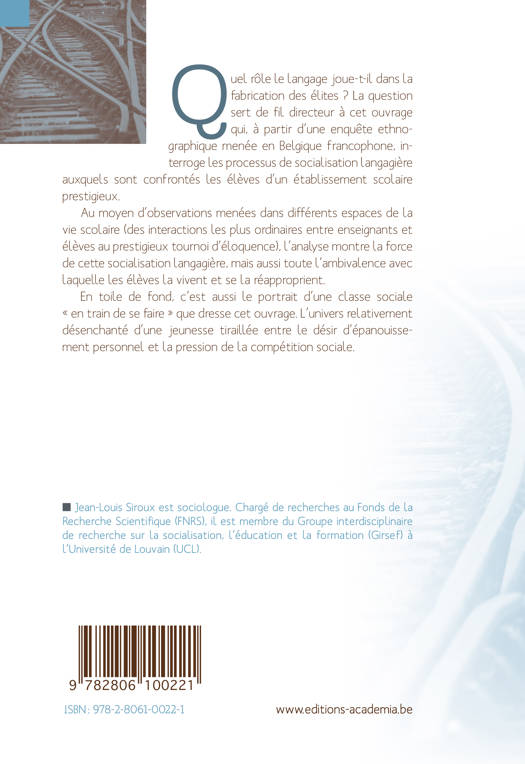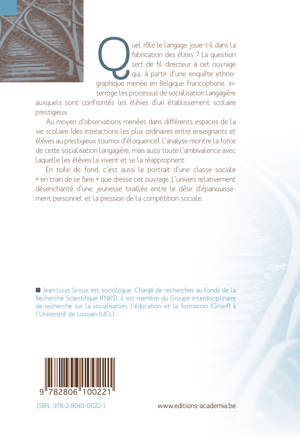 A partir d'une enquête ethnographique menée en Belgique francophone, ce livre interroge les processus de socialisation langagière auxquels sont confrontés les élèves d'un établissement scolaire prestigieux.