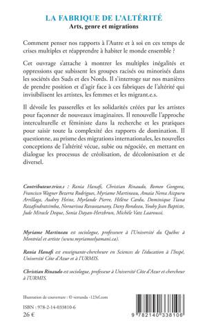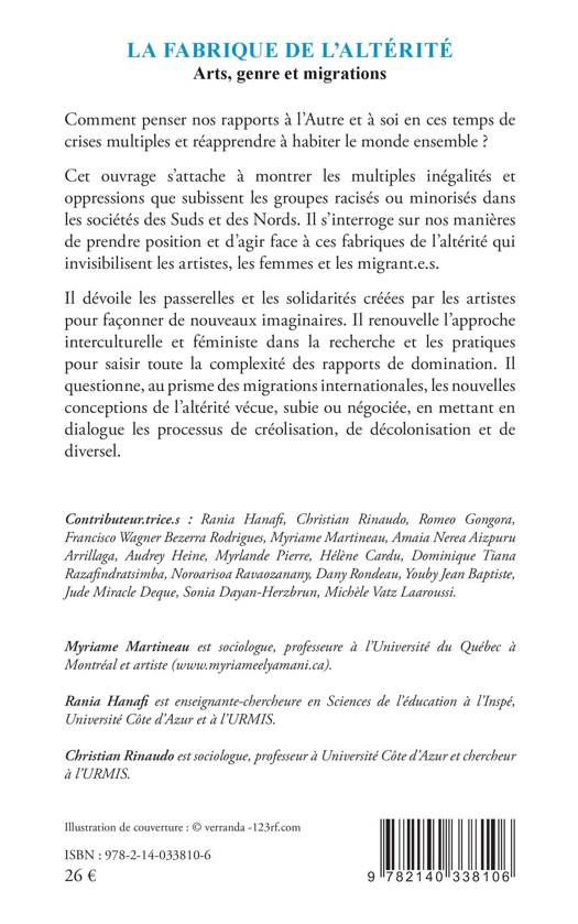 Comment penser nos rapports à l'Autre et à soi en ces temps de crises multiples et réapprendre à habiter le monde ensemble ? Cet ouvrage s'attache à montrer les multiples inégalités et oppressions que subissent les groupes racisés ou minorisés dans les sociétés des Suds et des Nords. Il s'interroge sur nos manières de prendre position et d'agir face à ces fabriques de l'altérité qui invisibilisent les artistes, les femmes et les migrant.e.s. Il dévoile les passerelles et les solidarités créées par les artistes pour façonner de nouveaux imaginaires. Il renouvelle l'approche interculturelle et féministe dans la recherche et les pratiques pour saisir toute la complexité des rapports de domination. Il questionne, au prisme des migrations internationales, les nouvelles conceptions de l'altérité vécue, subie ou négociée, en mettant en dialogue les processus de créolisation, de décolonisation et de diversel.