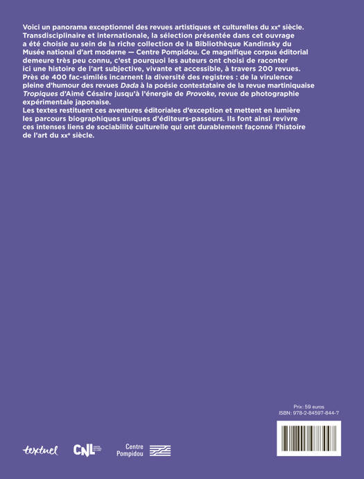 Voici pour la première fois réunies 200 revues d'art du 20e siècle avec 450 fac-similés. Transdisciplinaire et internationale, cette sélection est issue de la bibliothèque Kandinsky du centre Pompidou, qui, avec plus de 8000 revues est l'un des fond les plus riches au monde. Selon un déroulé chronologique, cette somme vient combler un manque en librairie : une autre histoire de la modernité au travers de l'extraordinaire inventivité de 200 aventures éditoriales.