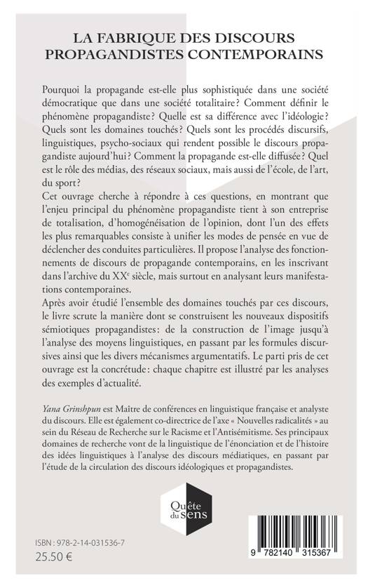 Pourquoi la propagande est-elle plus sophistiquée dans une société démocratique que dans une société totalitaire ? Comment définir le phénomène propagandiste ? Quelle est sa différence avec l'idéologie ? Quels sont les domaines touchés ? Quels sont les procédés discursifs, linguistiques, psycho-sociaux qui rendent possible le discours propagandiste aujourd'hui ? Comment la propagande est-elle diffusée ? Quel est le rôle des médias, des réseaux sociaux, mais aussi de l'école, de l'art, du sport ? Cet ouvrage cherche à répondre à ces questions, en montrant que l'enjeu principal du phénomène propagandiste tient à son entreprise de totalisation, d'homogénéisation de l'opinion, dont l'un des effets les plus remarquables consiste à unifier les modes de pensée en vue de déclencher des conduites particulières. Il propose l'analyse des fonctionnements de discours de propagande contemporains, en les inscrivant dans l'archive du XXe siècle, mais surtout en analysant leurs manifestations contemporaines. Après avoir étudié l'ensemble des domaines touchés par ces discours, le livre scrute la manière dont se construisent les nouveaux dispositifs sémiotiques propagandistes : de la construction de l'image jusqu'à l'analyse des moyens linguistiques, en passant par les formules discursives ainsi que les divers mécanismes argumentatifs.