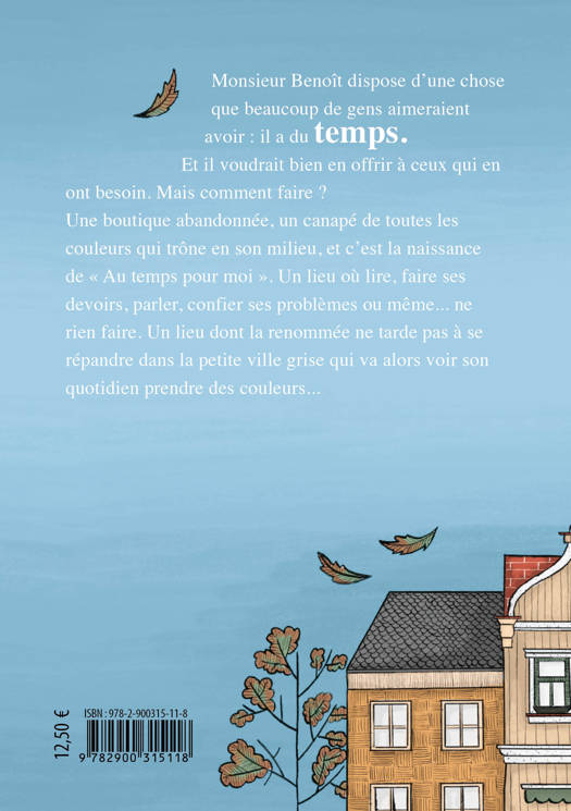 Monsieur Benoît dispose d'une chose que beaucoup de gens aimeraient avoir : il a du temps. Et il voudrait bien en offrir à ceux qui en ont besoin. Mais comment faire ? Une boutique abandonnée, un canapé de toutes les couleurs, et c'est la naissance de « Au temps pour moi ». C'est un lieu où lire, faire ses devoirs, créer une pièce de théâtre, confier ses problèmes ou même⦠ne rien faire. Un lieu dont la renommée ne tarde pas à se répandre dans la petite ville grise qui va alors voir son quotidien prendre des couleurs.
