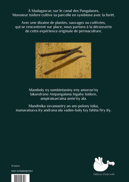 A Madagascar, sur le canal des Pangalanes, Monsieur Isidore cultive sa parcelle en symbiose avec la forêt. Par les portraits d’une dizaine de plantes que l’on peut rencontrer sur place, nous partons à la découverte de cette expérience originale de permaculture. Edition bilingue français/malgache.