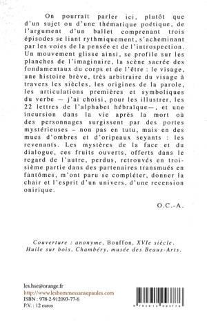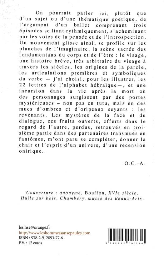 « On pourrait parler ici, plutôt que d’un sujet ou d’une thématique poétique, de l’argument d’un ballet comprenant trois épisodes se liant rythmiquement, s’acheminant par les voies de la pensée et de l’introspection. Un mouvement glisse ainsi, se profile sur les planches de l’imaginaire, la scène sacrée des fondamentaux du corps et de l’être : le visage, une histoire brève, très arbitraire du visage à travers les siècles, les origines de la parole, les articulations premières et symboliques du verbe — j’ai choisi, pour les illustrer, les 22 lettres de l’alphabet hébraïque -, et une incursion dans la vie après la mort où des personnages surgissent par des portes mystérieuses – non pas en tutu, mais en des mues d’ombres et d’oripeaux seyants : les revenants. Les mystères de la face et du dialogue, ces fruits ouverts, offerts dans le regard de l’autre, perdus, retrouvés en troisième partie dans des partenaires transmués en fantômes, m’ont paru se compléter, donner la chair et l’esprit d’un univers, d’une recension onirique », nous dit Odile Cohen-Abbas de sa très étonnante et détonante "Face proscrite", qui se compose de trois parties : « La face proscrite », « Répondances pour les 22 lettres de l’Alphabet hébraïque » et « Les revenants ».