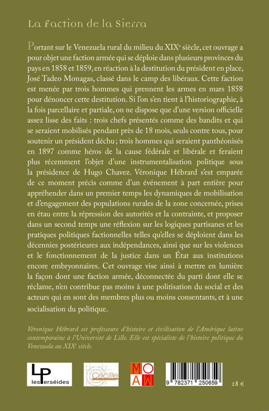 Portant sur le Venezuela rural du milieu du XIXe siècle, cet ouvrage a pour objet une faction armée qui se déploie dans plusieurs provinces du pays en 1858 et 1859, en réaction à la destitution du président en place, José Tadeo Monagas, classé dans le camp des libéraux. Cette faction est menée par trois hommes qui prennent les armes en mars 1858 pour dénoncer cette destitution. Si l’on s’en tient à l’historiographie, à la fois parcellaire et partiale, on ne dispose que d’une version officielle assez lisse des faits : trois chefs présentés comme des bandits et qui se seraient mobilisés pendant près de 18 mois, seuls contre tous, pour soutenir un président déchu ; trois hommes qui seraient panthéonisés en 1897 comme héros de la cause fédérale et libérale et feraient plus récemment l’objet d’une instrumentalisation politique sous la présidence de Hugo Chavez.
