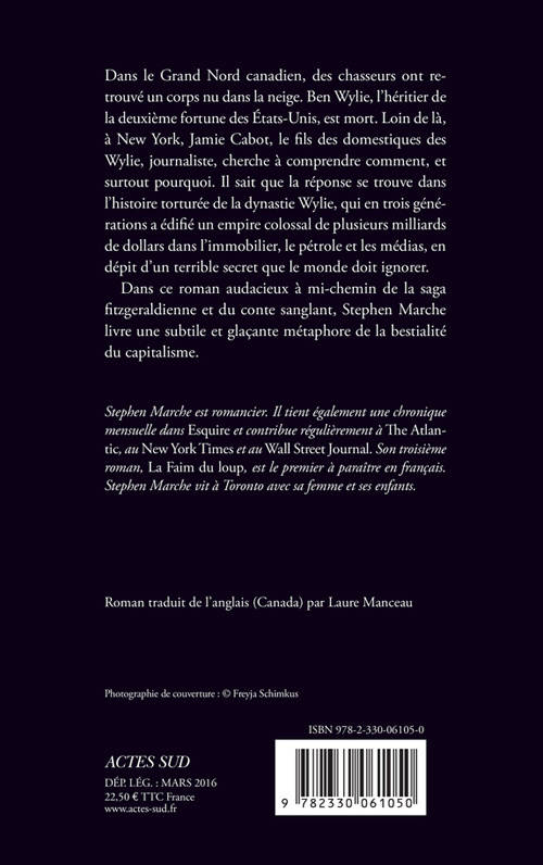 Des chasseurs ont retrouvé son corps nu dans la neige. C'est ainsi que s'ouvre le roman de Stephen Marche, dont le dernier ouvrage a été qualifié par la New York Times Book Review de "mélange de genres le plus excitant depuis L'Atlas des nuages de David Mitchell." Le corps dans la neige, retrouvé dans un endroit retiré au nord du Canada, est celui de Ben Wylie, l'héritier d'une dynastie qui a constitué la deuxième fortune des Etats-Unis. Loin de là, à New York, Jamie Cabot, le fils des domestiques des Wylie, va tenter de comprendre comment Ben Wylie est mort, et pour quel terrible secret. Roman tout à la fois fitzgeraldien et lycanthropique, La Faim du loup mêle le roman familial à une subtile et glaçante métaphore de la bestialité du capitalisme.