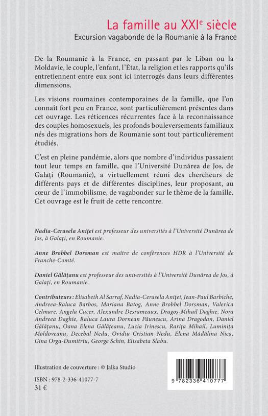 De la Roumanie à la France, en passant par le Liban ou la Moldavie, le couple, l'enfant, l'État, la religion et les rapports qu'ils entretiennent entre eux sont ici interrogés dans leurs différentes dimensions. Les visions roumaines contemporaines de la famille, que l'on connaît fort peu en France, sont particulièrement présentes dans cet ouvrage. Les réticences récurrentes face à la reconnaissance des couples homosexuels, les profonds bouleversements familiaux nés des migrations hors de Roumanie sont tout particulièrement étudiés. C'est en pleine pandémie, alors que nombre d'individus passaient tout leur temps en famille, que l'Université Dunărea de Jos, de Galaţi (Roumanie), a virtuellement réuni des chercheurs de différents pays et de différentes disciplines, leur proposant, au coeur de l'immobilisme, de vagabonder sur le thème de la famille. Cet ouvrage est le fruit de cette rencontre.