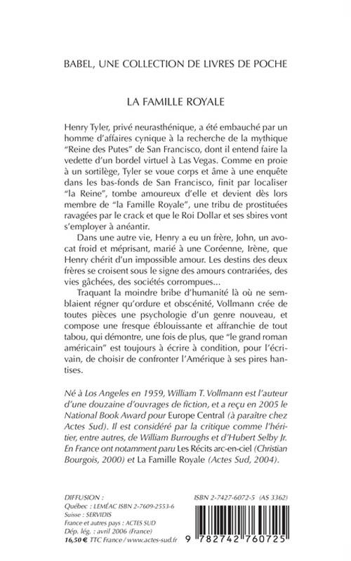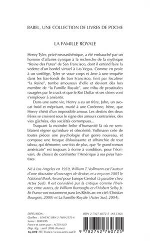Henry Tyler, privé neurasthénique, a été embauché par un homme d'affaires cynique à la recherche de la mythique "Reine des Putes" de San Francisco, dont il entend faire la vedette d'un bordel virtuel à Las Vegas. Comme en proie à un sortilège, Tyler se voue corps et âme à une enquête dans les bas-fonds de San Francisco, finît par localiser "la Reine", tombe amoureux d'elle et devient dès lors membre de "la Famille Royale", une tribu de prostituées ravagées par le crack et que le Roi Dollar et ses sbires vont s'employer à anéantir. Dans une autre vie, Henry a eu un frère, John, un avocat froid et méprisant, marié à une Coréenne, Irène, que Henry chérit d'un impossible amour. Les destins des deux frères se croisent sous le signe des amours contrariées, des vies gâchées, des sociétés corrompues... Traquant la moindre bribe d'humanité là où ne semblaient régner qu'ordure et obscénité, Vollmann crée de toutes pièces une psychologie d'un genre nouveau, et compose une fresque éblouissante et affranchie de tout tabou, qui démontre, une fois de plus, que "le grand roman américain" est toujours à écrire à condition, pour l'écrivain, de choisir de confronter l'Amérique à ses pires han- tises.