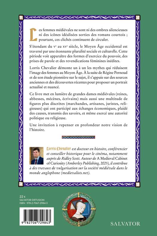 Les femmes médiévales ne sont ni des ombres silencieuses ni des icônes idéalisées sorties des romans courtois , pourtant, ces clichés continuent de circuler. S'étendant du ve au xve siècle, le Moyen Âge occidental est traversé par une étonnante pluralité sociale et culturelle. Cette période voit apparaître des formes d'exercice du pouvoir, des prises de parole et des revendications féminines inédites. Lorris Chevalier démonte un à un les mythes qui réduisent l'image des femmes au Moyen Âge. À la suite de Régine Pernoud et de son étude pionnière sur le sujet, il s'appuie sur des sources anciennes et des découvertes récentes pour proposer un portrait actualisé et nuancé. Ce livre met en lumière de grandes dames médiévales (reines, abbesses, mécènes, écrivains) mais aussi une multitude de figures plus discrètes (marchandes, artisanes, juristes, religieuses) qui ont participé aux échanges économiques, plaidé des causes, transmis des savoirs, et même exercé une autorité.