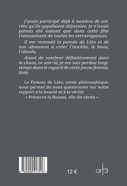 Alors que le Vésuve déverse son feu sur Pompéi, Léto termine la création de toute une vie : un buste de femme, en argile, qui renferme l’essence humaine, une oeuvre d’art dont on s’écrirait en la voyant : « Voilà ce qu’est la beauté, la vérité d’un être humain ». Cette sculpture passera de main en main au fil des siècles auprès de sept femmes dont elle partage la vie. À travers les lignes, nous est conté le rapport de chaque époque avec l’art et la beauté. <br /><br /><br /><br /><br /> La femme de Léto, conte philosophique, nous permet de nous questionner sur notre rapport à la beauté et à la vérité. « Préserve la Beauté, elle dit vérité ».