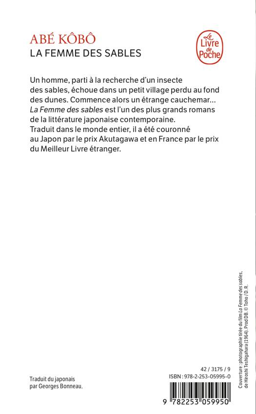 Heurs et malheurs d’un homme qui, parti à la recherche d’un insecte des sables, échoue dans un petit village perdu au fond des dunes. Commence alors un étrange cauchemar… La Femme des sables est incontestablement l’un des plus grands romans de la littérature japonaise contemporaine. Traduit dans le monde entier, il a été couronné, au Japon, par le prix Akutagawa (1962) et, en France, par le prix du Meilleur Livre étranger (1967).