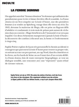 On appelait autrefois "femmes dominos" les femmes qui utilisaient des pseudonymes pour écrire et laisser derrière elles le scandale. La Femme domino est un livre-enquête sur Léonie d'Aunet, une des premières femmes à se rendre au Spitzberg, voyage dont elle tirera un récit. En 1845, devenue la maîtresse de Hugo, elle est prise en flagrant délit d'adultère et condamnée à trois mois de prison puis autant de réclusion dans un couvent - Hugo bénéficiera de l'immunité et ne sera pas inquiété. Ces deux événements marqueront à jamais Léonie d'Aunet : la découverte des confins à dix-neuf ans, la honte et l'enfermement à vingt-cinq.