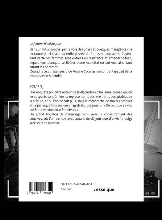 La femme n’existe plus Dans un futur proche, par la voie des urnes et quelques manigances, la dictature patriarcale est enfin passée du fantasme aux actes. Cependant certaines femmes sont entrées en résistance et entendent bien, depuis leur planque, libérer les femmes d’une exploitation qui enchaîne tout autant les hommes. Quand le Scum manifesto de Valerie Solanas rencontre Papy fait de la résistance.
