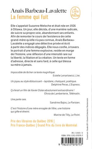 Un ouvrage incandescent de beauté. Divisé en courts chapitres comme autant de petits poèmes, polaroïds d'une époque, La Femme qui fuit raconte notre histoire à toutes. Geneviève Patterson, Châtelaine.