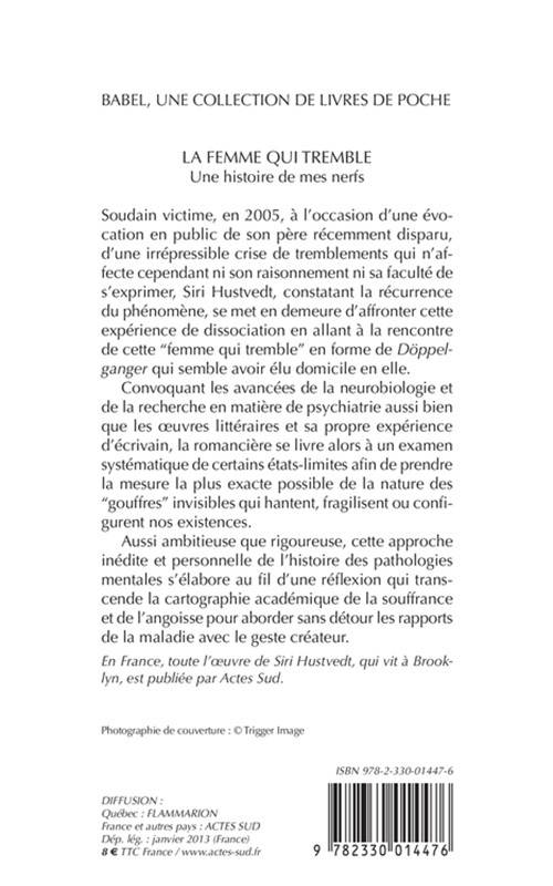 Soudain victime, en 2005, à l'occasion d'une évocation en public de son père récemment disparu, d'une irrépressible crise de tremblements qui n'affecte cependant ni son raisonnement ni sa faculté de s'exprimer, Siri Hustvedt, constatant la récurrence du phénomène, se met en demeure d'affronter cette expérience de dissociation en allant à la rencontre de cette "femme qui tremble" en forme de «Döppelganger» qui semble avoir élu domicile en elle.