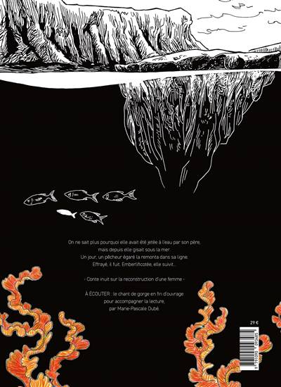 Au fond de la mer glacée de l'arctique git le squelette d'une femme que son père avait poussé là. Accroché à la ligne de pêche d'un inuit, le squelette est remonté à la surface. Emberlificotée à la ligne, la femme squelette suit le pêcheur jusqu'à son igloo. L'homme observe cet être étrange tapi dans l'ombre qui ne semble plus si effrayant et prend le temps de démêler son fil des os et de le réchauffer. Durant la nuit la femme squelette s'approche de son sauveteur et boit une larme. Le battement du coeur de l'homme raisonne comme un tambour, et petit à petit elle retrouve muscles, organes, peau, cheveux et tatouages. Cécile Vallade rend hommage aux paysages glacés et à la faune de l'arctique mais elle apporte aussi quelques touches d'humour à cette légende inuit sur la reconstruction d'une femme. La narration muette renforce le lien entre les deux personnages, et un chant de gorge dans la tradition inuit composé et enregistré par Marie-Pascale Dubé est accessible via des QR codes.