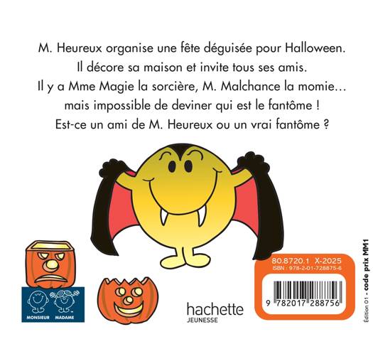 M. Heureux organise une fête déguisée pour Halloween. Il décore sa maison et invite tous ses amis. Il y a Mme Magie la sorcière, M. Malchance la momie… mais impossible de deviner qui est le fantôme ! Est-ce un ami de M. Heureux ou un vrai fantôme ?