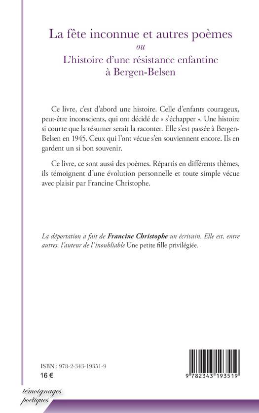 Ce livre, c’est d’abord une histoire. Celle d’enfants courageux, peut-être inconscients, qui ont décidé de « s’échapper ». Une histoire si courte que la résumer serait la raconter. Elle s’est passée à Bergen-Belsen en 1945. Ceux qui l’ont vécue s’en souviennent encore. Ils en gardent un si bon souvenir. Ce livre, ce sont aussi des poèmes. Répartis en différents thèmes, ils témoignent d’une évolution personnelle et toute simple vécue avec plaisir par Francine Christophe.