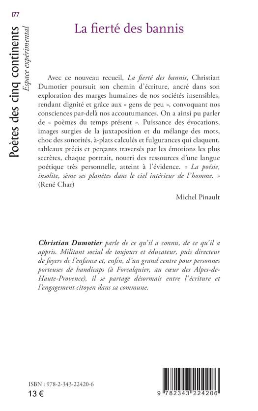 Avec ce nouveau recueil, La fierté des bannis, Christian Dumotier poursuit son chemin d'écriture, ancré dans son exploration des marges humaines de nos sociétés insensibles, rendant dignité et grâce aux gens de peu, convoquant nos consciences par-delà nos accoutumances. On a ainsi pu parler de poèmes du temps présent . Puissance des évocations, images surgies de la juxtaposition et du mélange des mots, choc des sonorités, à-plats calculés et fulgurances qui claquent, tableaux précis et perçants traversés par les émotions les plus secrètes, chaque portrait, nourri des ressources d'une langue poétique très personnelle, atteint à l'évidence. La poésie, insolite, sème ses planètes dans le ciel intérieur de l' homme. (René Char) Michel Pinault