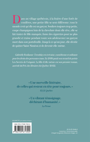 Dans un village québécois, à la lisière d’une forêt de conifères, une petite fille se sent différente ; tout le monde croit qu’elle est un garçon. Souliers toujours trop petits, coupe champignon loin de la chevelure dont elle rêve, elle se fait traiter de fille manquée, fume des cigarettes pour ne plus grandir et traîne pendant toute son adolescence un garçon mort dans son portefeuille. Jusqu’à ce qu’un jour, elle décide de quitter Saint-Siméon et de devenir elle-même.