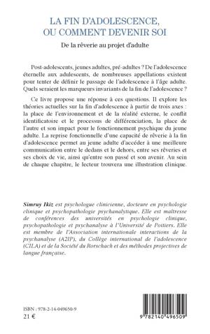 Post-adolescents, jeunes adultes, pré-adultes ? De l'adolescence éternelle aux adulescents, de nombreuses appellations existent pour tenter de définir le passage de l'adolescence à l'âge adulte. Quels seraient les marqueurs invariants de la fin de l'adolescence ? Ce livre propose une réponse à ces questions. Il explore les théories actuelles sur la fin d'adolescence à partir de trois axes: la place de l'environnement et de la réalité externe, le conflit identificatoire et le processus de différenciation, la place de l'autre et son impact pour le fonctionnement psychique du jeune adulte. La reprise fonctionnelle d'une capacité de rêverie à la fin d'adolescence permet au jeune adulte d'accéder à une meilleure communication entre le dedans et le dehors, entre ses rêveries et ses choix de vie, ainsi qu'entre son passé et son avenir. Au sein de chaque chapitre, le lecteur trouvera une illustration clinique.