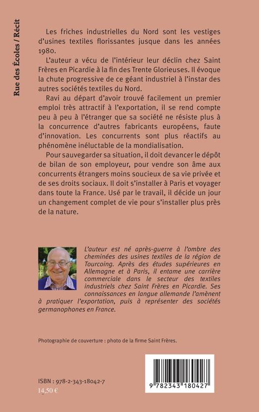 Les friches industrielles du Nord sont les vestiges d'usines textiles florissantes jusque dans les années 1980. L'auteur a vécu de l'intérieur leur déclin chez Saint Frères, entreprise picarde spécialisée dans le tissage de la toile de jute, à la fin des Trente Glorieuses. Il évoque la chute progressive de ce géant industriel à l'instar des autres sociétés textiles du Nord. Devançant le dépôt de bilan de son employeur, il travaille pour des concurrents étrangers moins soucieux de sa vie privée et de ses droits sociaux. Il doit s'installer à Paris et voyager dans toute la France. Usé par le travail, il décide un jour un changement complet de vie pour s'installer plus près de la nature.