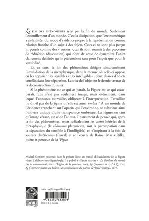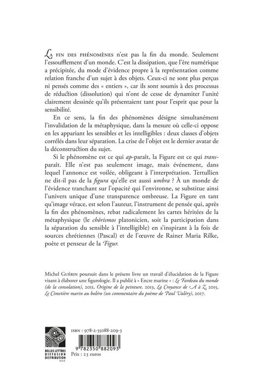 La fin des phenomenes n'est pas la fin du monde. Seulement l'essoufflement d'un monde. C'est la dissipation, que l'ere numerique a precipitee, du mode d'evidence propre a la representation comme relation franche d'un sujet a des objets. Ceux-ci ne sont plus percus ni penses comme des entiers , car ils sont soumis a des processus de reduction (dissolution) qui n'ont de cesse de dynamiter l'unite clairement dessinee qu'ils presentaient tant pour l'esprit que pour la sensibilite. En ce sens, la fin des phenomenes designe simultanement l'invalidation de la metaphysique, dans la mesure ou celle-ci oppose en les appariant les sensibles et les intelligibles: deux classes d'objets correles dans leur separation. La crise de l'objet est le dernier avatar de la deconstruction du sujet. Si le phenomene est ce qui ap-parait, la Figure est ce qui trans-parait. Elle n'est pas seulement image, mais evenement, dans lequel l'annonce est voilee, obligeant a l'interpretation. Tertullien ne dit-il pas de la figura qu'elle est aussi umbra ? A un monde de l'evidence tranchant sur l'opacite qui l'environne, se substitue ainsi l'univers unique d'une transparence ombreuse. La Figure en tant qu'image verace, est selon l'auteur, l'instrument de pensee qui, apres la fin des phenomenes, rebat radicalement les cartes heritees de la metaphysique (le chorismos platonicien, soit la participation dans la separation du sensible a l'intelligible) en s'inspirant a la fois de sources chretiennes (Pascal) et de l'oeuvre de Rainer Maria Rilke, poete et penseur de la Figur.
