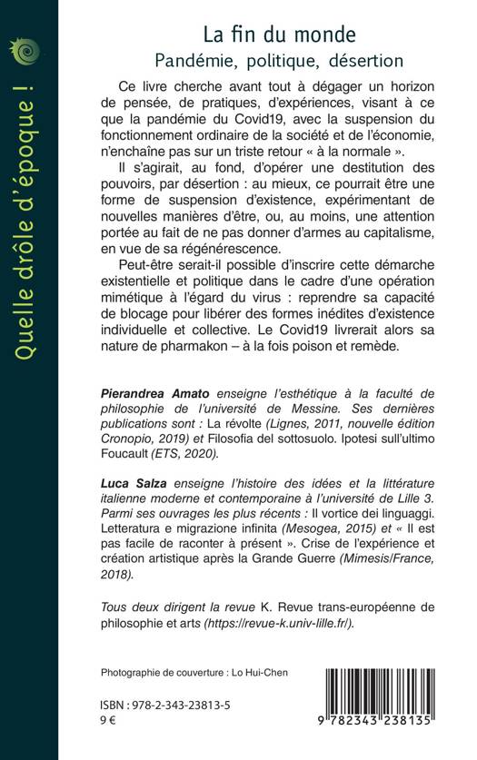 Cet ouvrage cherche à dégager un horizon de pensée, de pratiques, d'expériences, visant à ce que la pandémie du Covid19, avec la suspension du fonctionnement ordinaire de la société et de l'économie, n'enchaîne pas sur un triste retour « à la normale ». Il s'agirait, au fond, d'opérer une destitution des pouvoirs, par désertion : au mieux, ce pourrait être une forme de suspension d'existence, expérimentant de nouvelles manières d'être, ou, au moins, une attention portée au fait de ne pas donner d'armes au capitalisme, en vue de sa régénérescence. Peut-être serait-il possible d'inscrire cette démarche existentielle et politique dans le cadre d'une opération mimétique à l'égard du virus : reprendre sa capacité de blocage pour libérer des formes inédites d'existence individuelle et collective. Le Covid19 livrerait serait alors un pharmakon, à la fois poison et remède.