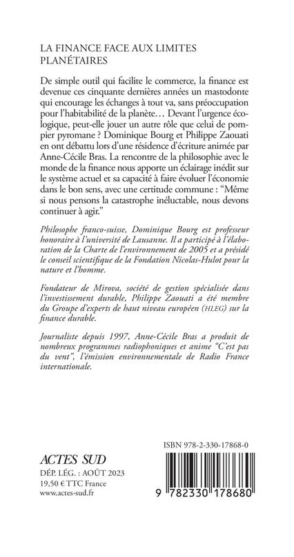 De simple outil qui facilite le commerce, la finance est devenue ces cinquante dernières années un mastodonte qui encourage les échanges à tout va, sans préoccupation pour l'habitabilité de la planète... Devant l'urgence écologique, peut-elle jouer un autre rôle que celui de pompier pyromane ? Dominique Bourg et Philippe Zaouati en ont débattu lors d'une résidence d'écriture animée par Anne-Cécile Bras. La rencontre de la philosophie avec le monde de la finance nous apporte un éclairage inédit sur le système actuel et sa capacité à faire évoluer l'économie dans le bon sens, avec une certitude commune : "Même si nous pensons la catastrophe inéluctable, nous devons continuer à agir."
