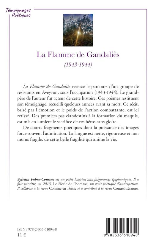 La Flamme de Gandaliès retrace le parcours d'un groupe de résistants en Aveyron, sous l'occupation (1943-1944). Le grand-père de l'auteur fut acteur de cette histoire. Ces poèmes restituent son témoignage, recueilli quelques années avant sa mort. Ce récit, brisé par l'émotion et le poids de l'action combattante, est ici retissé. Des premiers pas clandestins à la formation du maquis, est mis en lumière le sacrifice de ces héros sans gloire. De courts fragments poétiques dont la puissance des images force souvent l'admiration. La langue est nette, rigoureuse et non moins fragile, de cette belle fragilité qui anime la vie.