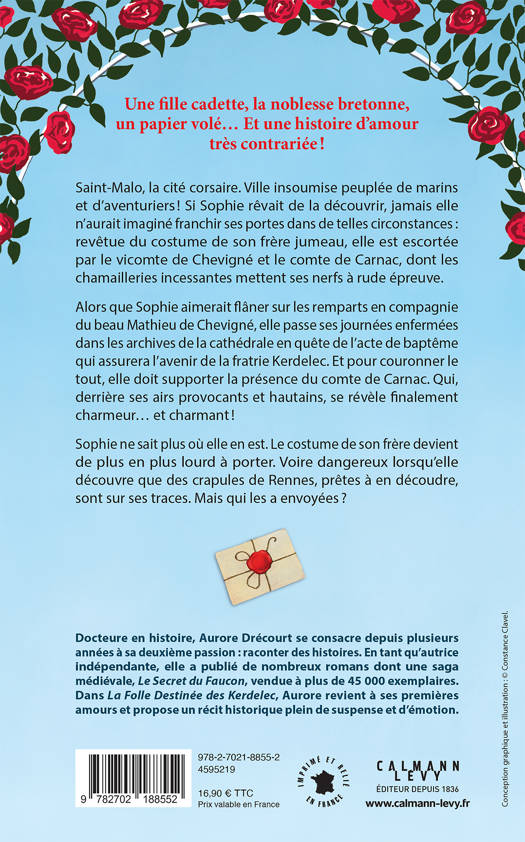 Saint-Malo, la cité corsaire. Ville insoumise peuplée de marins et d’aventuriers ! Si Sophie rêvait de la découvrir, jamais elle n’aurait imaginé franchir ses portes dans de telles circonstances : revêtue du costume de son frère jumeau, elle est escortée par le vicomte de Chevigné et le comte de Carnac, dont les chamailleries incessantes mettent ses nerfs à rude épreuve. Alors que Sophie aimerait flâner sur les remparts en compagnie du beau Mathieu de Chevigné, elle passe ses journées enfermées dans les archives de la cathédrale en quête de l’acte de baptême qui assurera l’avenir de la fratrie Kerdelec. Et pour couronner le tout, elle doit supporter la présence du comte de Carnac. Qui, derrière ses airs provocants et hautains, se révèle finalement charmeur… et charmant ! Sophie ne sait plus où elle en est. Le costume de son frère devient de plus en plus lourd à porter. Voire dangereux lorsqu’elle découvre que des crapules de Rennes, prêtes à en découdre, sont sur ses traces. Mais qui les a envoyées ?