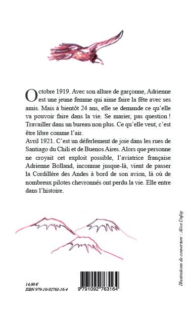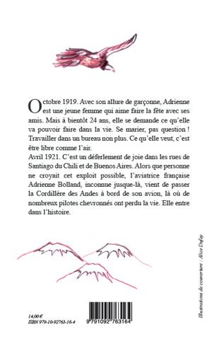 Octobre 1919. Avec son allure de garçonne, Adrienne est une jeune femme qui aime faire la fête avec ses amis. Mais à bientôt 24 ans, elle se demande ce qu’elle va pouvoir faire dans la vie. Se marier, pas question ! Travailler dans un bureau non plus. Ce qu’elle veut, c’est être libre comme l’air. Avril 1921. C’est un déferlement de joie dans les rues de Santiago du Chili et de Buenos Aires. Alors que personne ne croyait cet exploit possible, l’aviatrice française Adrienne Bolland, inconnue jusque-là, vient de passer la Cordillère des Andes à bord de son avion, là où nombre de pilotes chevronnés ont perdu la vie. Elle entre dans l’histoire.