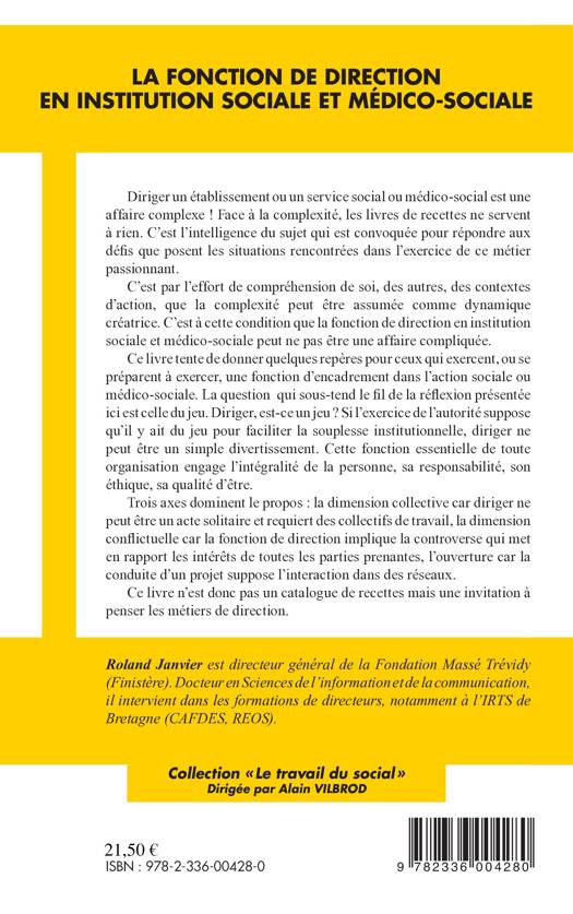 Il s'agit de donner quelques repères pour ceux qui dirigent, ou se préparent à exercer une fonction d'encadrement dans l'action sociale ou médico-sociale. Trois axes dominent le propos : la dimension collective : diriger ne peut être un acte solitaire ; la dimension conflictuelle : la fonction de direction implique la controverse entre les intérêts de toutes les parties prenantes ; l'ouverture : la conduite d'un projet suppose l'interaction dans des réseaux. Voici une invitation à penser les métiers de direction.