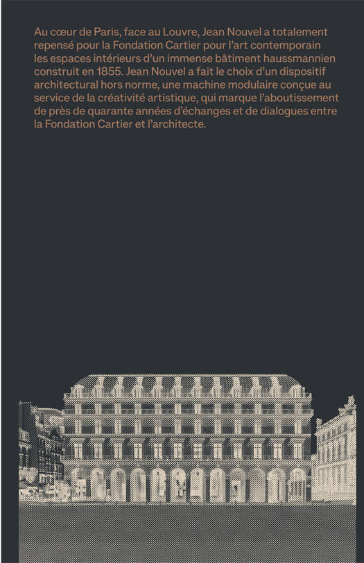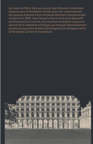 En octobre 2025, la Fondation Cartier pour l'art contemporain ouvre les portes de son nouvel espace d'expositions dans un immense immeuble haussmannien situé au coeur de Paris, au 2 place du Palais-Royal. Pour la Fondation Cartier, Jean Nouvel a repensé les espaces intérieurs du bâtiment afin d'offrir une architecture modulaire au service de la créativité artistique. À l'occasion de cette inauguration, la Fondation Cartier publie un ouvrage richement illustré consacré au projet architectural de Jean Nouvel. À travers de nombreuses photographies des espaces intérieurs et extérieurs du bâtiment réalisées par Martin Argyroglo et Danica O. Kus, des textes des historiens de l'architecture Beatriz Colomina et Antoine Picon, de la commissaire Béatrice Grenier, et des architectes Mathieu Forest et Cyril Desroche, cet ouvrage retrace l'histoire singulière du bâtiment et explore les spécificités techniques d'un dispositif architectural ambitieux.