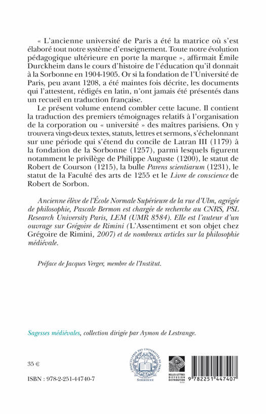 "L'ancienne universite de Paris a ete la matrice ou s'est elabore tout notre systeme d'enseignement. Toute notre evolution pedagogique ulterieure en porte la marque ", affirmait Emile Durckheim dans le cours d'histoire de l'education qu'il donnait a la Sorbonne en 1904-1905. Or si la fondation de l'Universite de Paris, peu avant 1208, a ete maintes fois decrite, les documents qui l'attestent, rediges en latin, n'ont jamais ete presentes dans un recueil en traduction francaise. Le present volume entend combler cette lacune. Il contient la traduction des premiers temoignages relatifs a l'organisation de la corporation ou "universite" des maitres parisiens. On y trouvera vingt-deux textes, statuts, lettres et sermons, s'echelonnant sur une periode qui s'etend du concile de Latran III (1179) a la fondation de la Sorbonne (1257), parmi lesquels figurent notamment le privilege de Philippe Auguste (1200), le statut de Robert de Courson (1215), la bulle Parens scientiarum (1231), le statut de la Faculte des arts de 1255 et le Livre de conscience de Robert de Sorbon.
