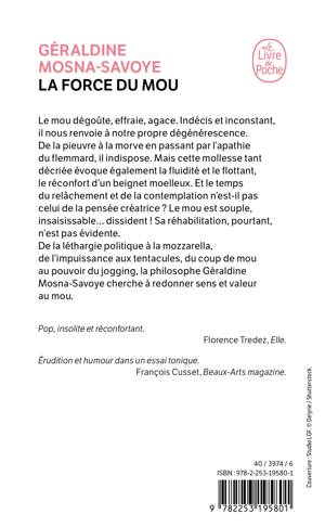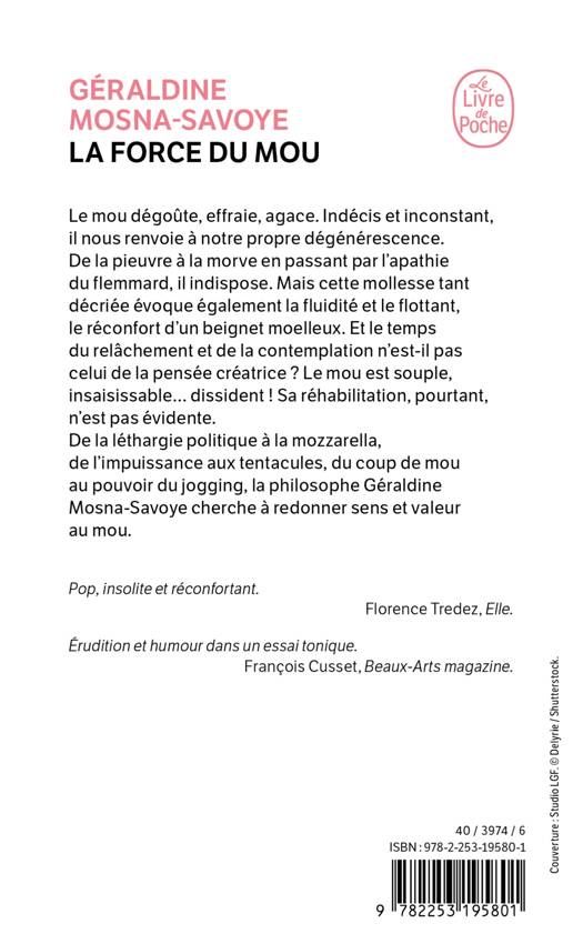 Le mou dégoûte, effraie, agace. Indécis et inconstant, il nous renvoie à notre propre dégénérescence. De la pieuvre à la morve en passant par l’apathie du flemmard, il indispose. Mais cette mollesse tant décriée évoque également la fluidité et le flottant, le réconfort d’un beignet moelleux. Et le temps du relâchement et de la contemplation n’est-il pas celui de la pensée créatrice ? Le mou est souple, insaisissable… dissident ! Sa réhabilitation, pourtant, n’est pas évidente. De la léthargie politique à la mozzarella, de l’impuissance aux tentacules, du coup de mou au pouvoir du jogging, la philosophe Géraldine Mosna-Savoye cherche à redonner sens et valeur au mou.