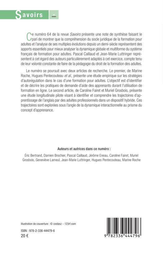 Ce numéro 64 de la revue Savoirs présente une note de synthèse faisant le pari de montrer que la compréhension du socle juridique de la formation pour adultes et l'analyse de ses multiples évolutions depuis un demi-siècle représentent des apports essentiels pour mieux analyser la dynamique globale et multiforme du système français de formation pour adultes. Pascal Caillaud et Jean-Marie Luttringer représentent à cet égard des auteurs particulièrement adaptés à cet exercice, compte tenu de leur volonté constante de faire de la pédagogie du droit de la formation des adultes. Le numéro se poursuit avec deux articles de recherche. Le premier, de Marine Roche, Hugues Pentecouteau et al., présente une étude empirique sur les stratégies d'autorégulation dans le cas d'une formation pour adultes. L'objectif est d'identifier et de décrire les pratiques de demande d'aide des apprenants durant l'utilisation de formation en ligne. Le second article, de Caroline Fairet et Muriel Grosbois, présente une étude longitudinale pilote visant à identifier et comprendre les trajectoires d'apprentissage de l'anglais par des adultes professionnels dans un dispositif hybride. Ces trajectoires sont explorées sous l'angle de la dynamique interactionnelle au prisme du concept d'apprenance.