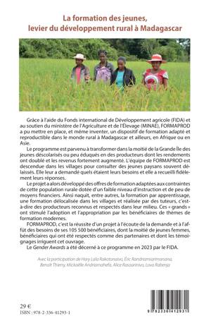 Moderniser les pratiques agricoles et lancer de jeunes entrepreneurs ! Grâce au soutien du Fonds International de Développement Agricole (FIDA) et du Gouvernement malgache, FORMAPROD a inventé et mis en place un dispositif de formation adapté et reproductible dans le monde rural à Madagascar et ailleurs, en Afrique ou en Asie. Tout en s’intégrant à la politique nationale de formation agricole et rurale (FAR), !’équipe du projet a été proactive. Elle est descendue dans les villages pour consulter les jeunes paysans délaissés et en a recueilli fidèlement les besoins. Le programme a alors développé des offres de formation sur le terrain adaptées aux contraintes de cette population rurale peu éduquée, peu mobile, sans moyens financiers et souvent enclavée. Il a ainsi transformé, dans la moitié de la Grande Ile, de jeunes déscolarisés en des producteurs dont les rendements ont doublé et les revenus fortement augmenté. FORMAPROD, c’est la réussite d’un projet à l’écoute de la demande et à l'affût des besoins de ses 105.500 bénéficiaires, dont la moitié de jeunes femmes, bénéficiaires qui ont été respectés comme des partenaires et dont les témoignages irriguent cet ouvrage. Le Gender Awards a été décerné à ce programme en 2023 par le FIDA.