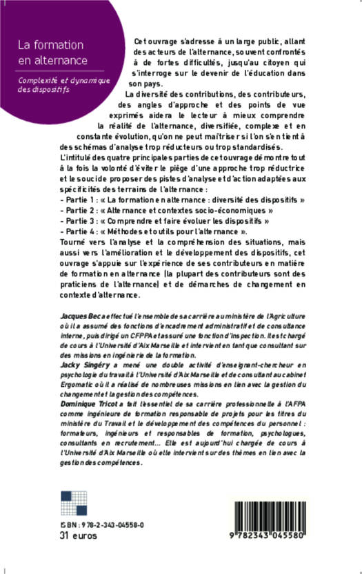 Cet ouvrage s'adresse à un public multiple, allant des acteurs de l'alternance, souvent confrontés à de fortes difficultés, jusqu'au citoyen qui s'interroge sur le devenir de l'éducation dans son pays. La diversité des contributions, des contributeurs, des angles d'approche et des points de vue exprimés aidera le lecteur à mieux comprendre la réalité de l'alternance, diversifiée, complexe et en constante évolution, qu'on ne peut maîtriser si l'on s'en tient à des schémas d'analyse trop réducteurs ou trop standardisés.