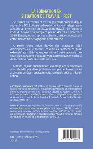 Se former en travaillant c'est légalement possible depuis septembre 2018. À la suite d'expérimentations, le législateur a inscrit la Formation en Situation de Travail (FEST) dans le Code du travail et a complété par un décret en décembre 2018. Depuis, les entreprises et les institutions investissent cette innovation pédagogique prometteuse. À partir d'une veille étayée des pratiques FEST développées sur le terrain, les auteurs dressent ce guide exhaustif aussi théorique que pratique à destination de tous ceux qui souhaitent s'engager vers cette nouvelle modalité de formation professionnelle continue. Acteurs, enjeux, financements, avantages et perspectives sont abordés par deux praticiens complémentaires qui les analysent de façon opérationnelle. Un guide pour la mise en action.