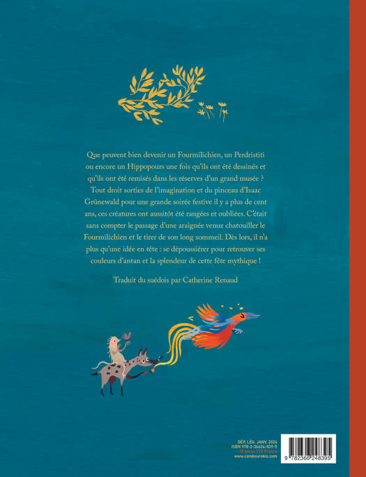 Que peuvent bien devenir un Fourmilichien, un Perdristiti ou encore un Hippopours une fois qu'ils ont été dessinés et qu'ils ont été remisés dans les réserves d'un grand musée ? Tout droit sorties de l'imagination et du pinceau d'Isaac Grünewald pour une grande soirée festive il y a plus de cent ans, ces créatures ont aussitôt été rangées et oubliées. C'était sans compter le passage d'une araignée venue chatouiller le Fourmilichien et le tirer de son long sommeil. Dès lors, il n'a plus qu'une idée en tête : se dépoussiérer pour retrouver ses couleurs d'antan et la splendeur de cette fête mythique !